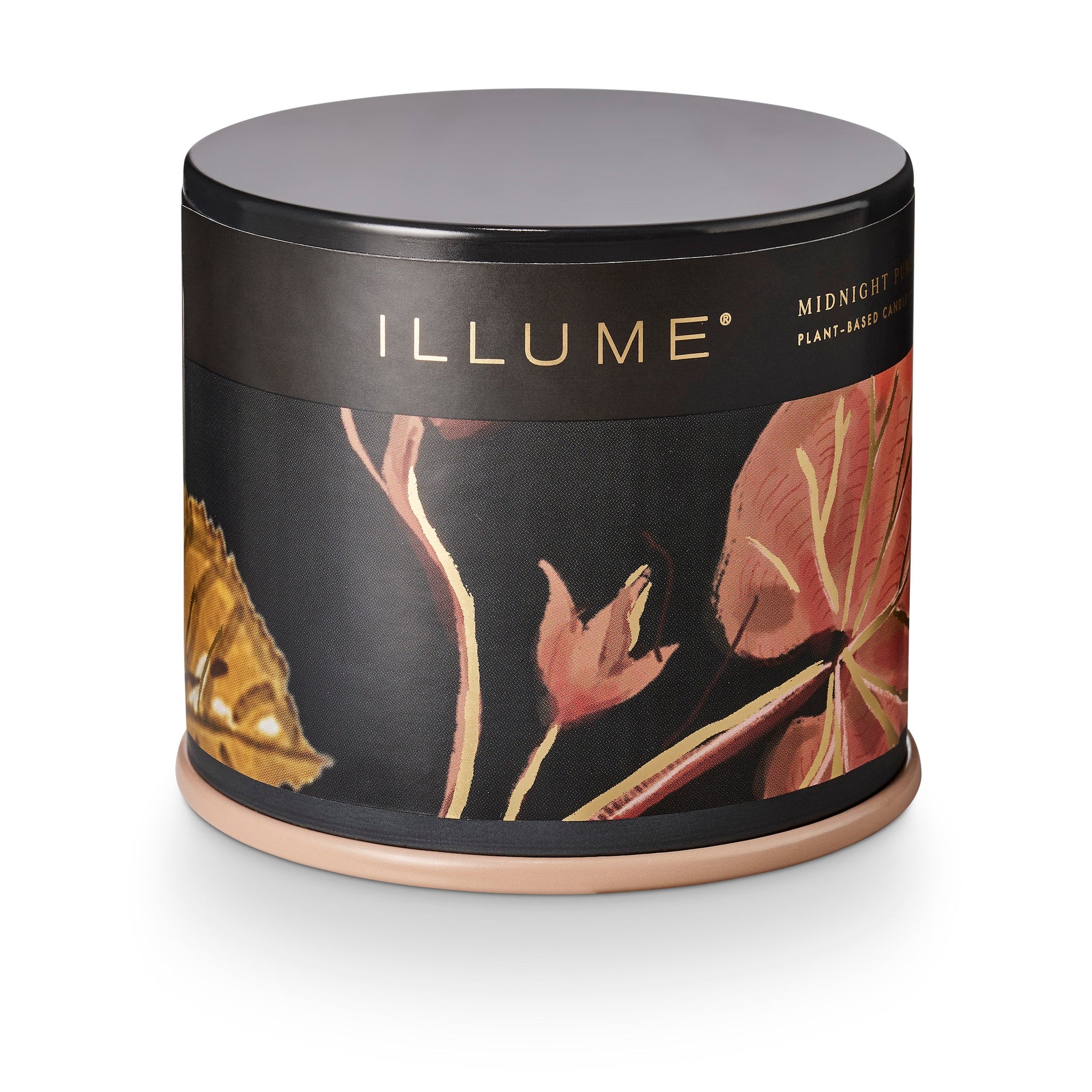Designed as a pop of pattern, Illume's vanity tins have a full wrap label on textured stock, interior pattern with metallic details, and a color rolled edge to complement the colored wax. Tin is used for its lovely illuminating qualities and because it is infinitely recyclable.