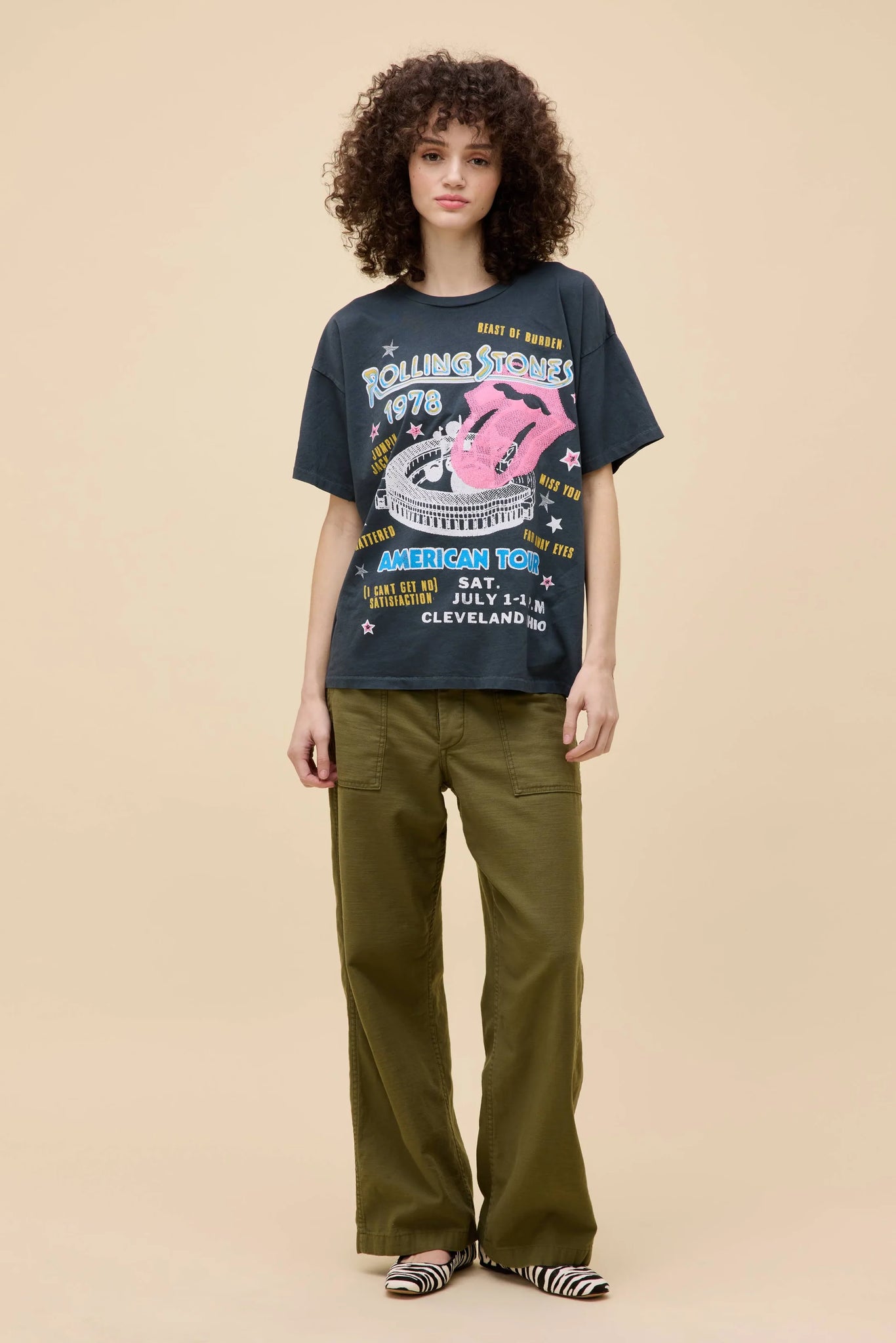 Rated as The Rolling Stones' best, the group's peak 1978 American Tour is celebrated on this Merch Tee memento. Featuring a flier like design for one of their many show stops and stamped with The Stones' setlist and most classic iconography. Accented in puff ink.