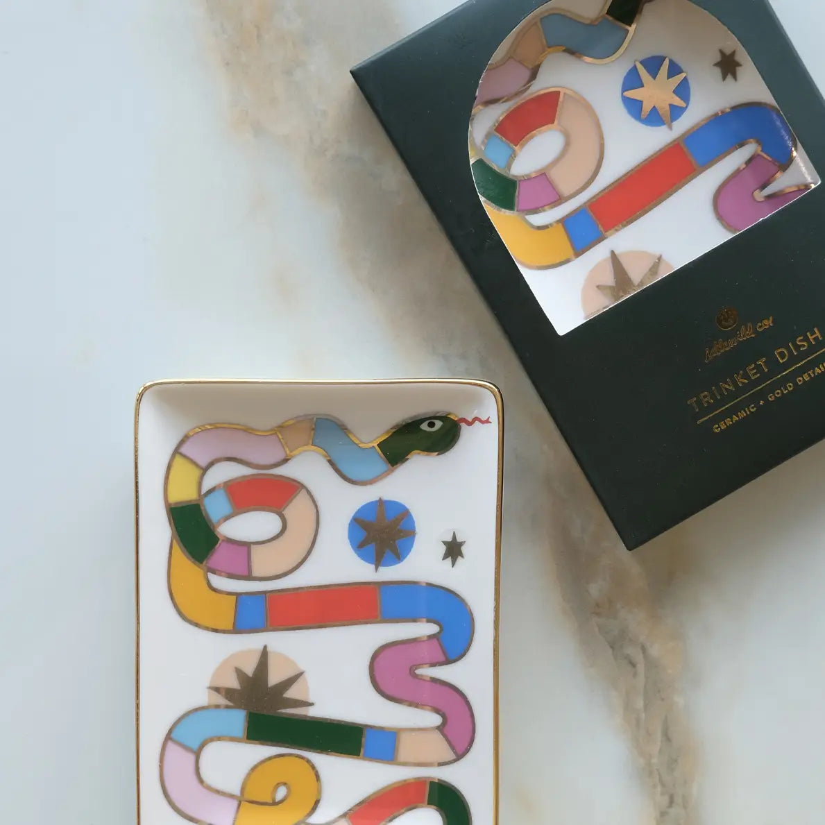 White porcelain is adorned with our colorful, hand-painted designs, and lined edge in 10k gold for added flair. Perfectly packaged in plastic-free gift boxes, pretty enough to give without wrapping! • 3.25″ x 4.5″ Dish • Ceramic with 10k Gold Detailing • Plastic-Free Gift Box