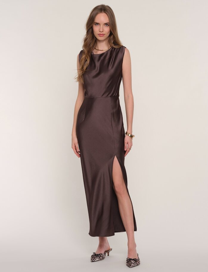The Etal Dress is a simple, draped midi dress. Made from a hammered satin, it features pleated shoulders, a flattering waist seam and a side slit.