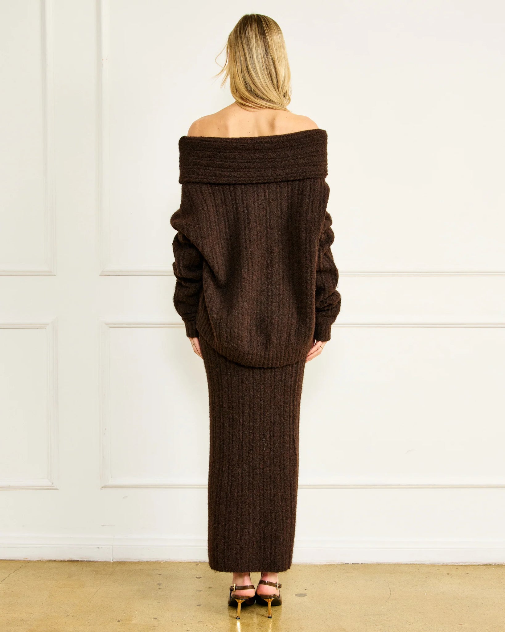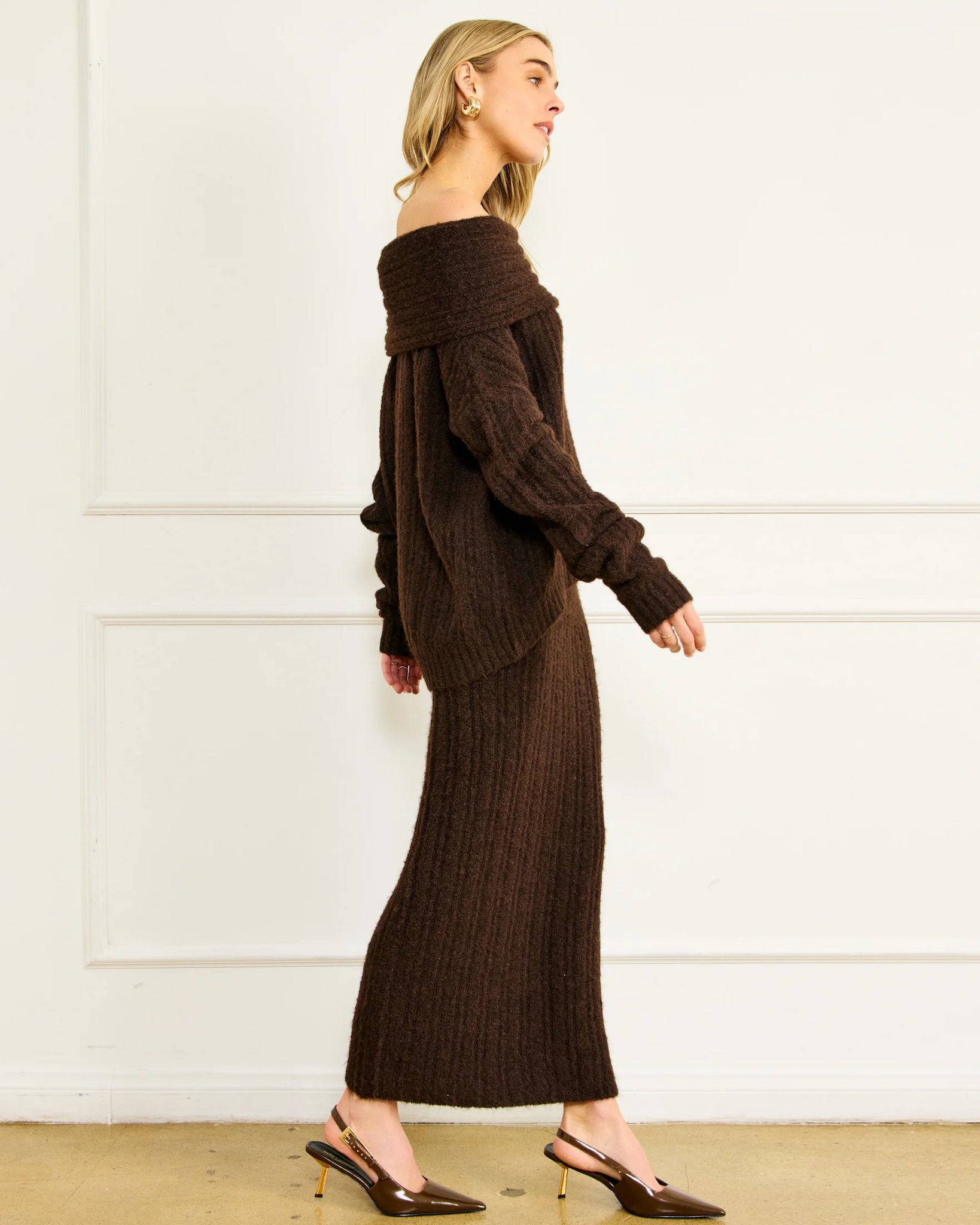 - Mid-weight rib knit sweater- Self-covered elastic waistband