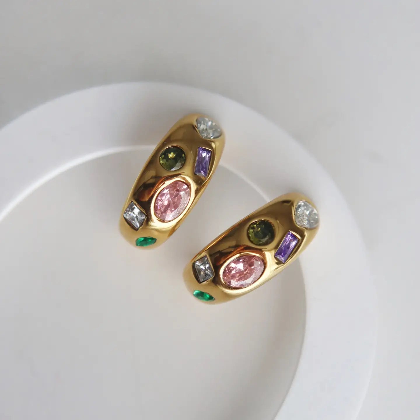 Add a splash of color to your jewelry collection with our Mosaic Hoops. These Mosaic Hoops feature a stunning mix of colorful gems in varying shapes, making them a perfect addition to any outfit. Get our Mosaic Ring for a matching set!