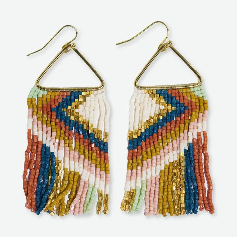 Elevate your style with the stunning Paige Ascending Blocks Beaded Fringe Earrings in Desert. These eye-catching earrings feature a unique design that combines geometric shapes with the fluidity of fringe, creating a captivating accessory that's perfect for any occasion. From a brass triangle hanger, delicate beaded fringes cascade downward, adding movement and texture to the earrings. As you move, the fringes sway gracefully, catching the light and adding a touch of glamour to your look.