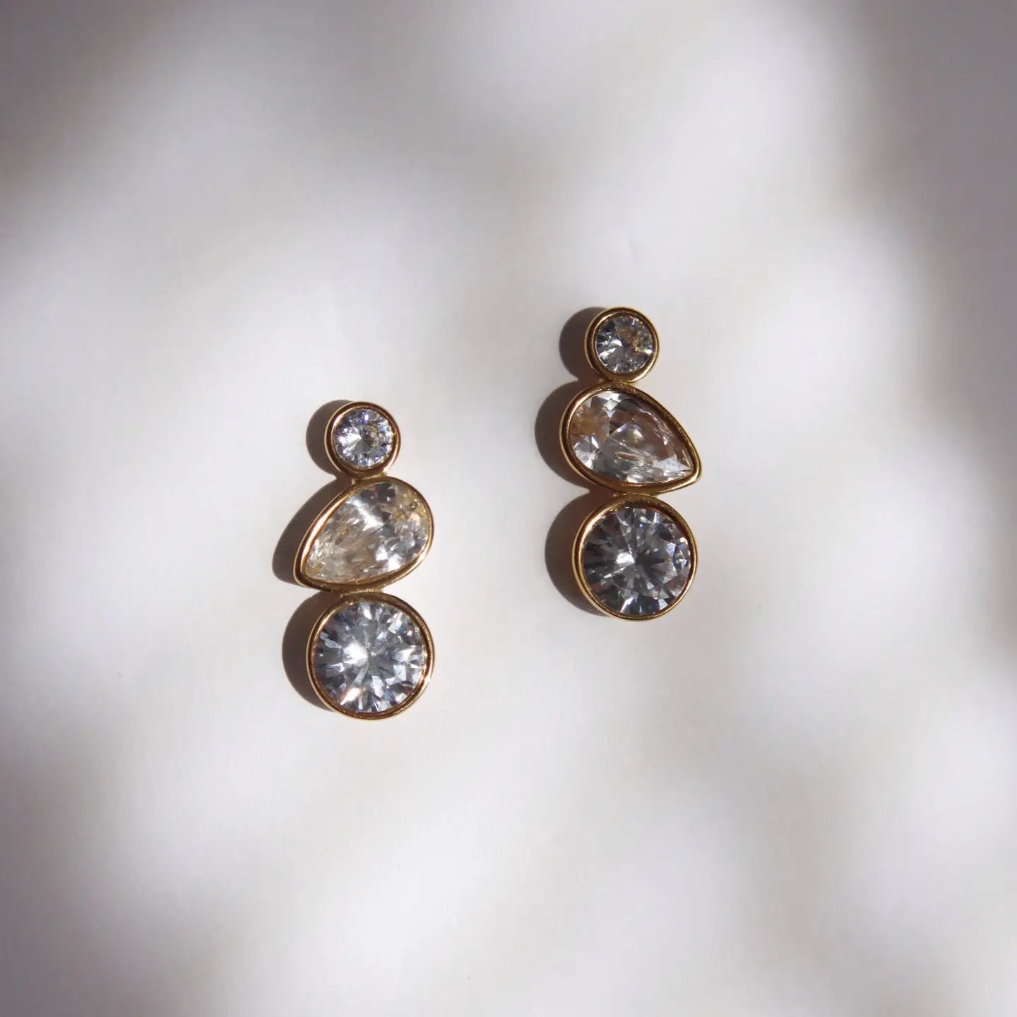 Make a statement with the luxurious Simone Earrings. Featuring three sparkling zirconia stones, these drop earrings will add a touch of glamour to any outfit. Elevate your style and make a bold impression with these stunning statement earrings.