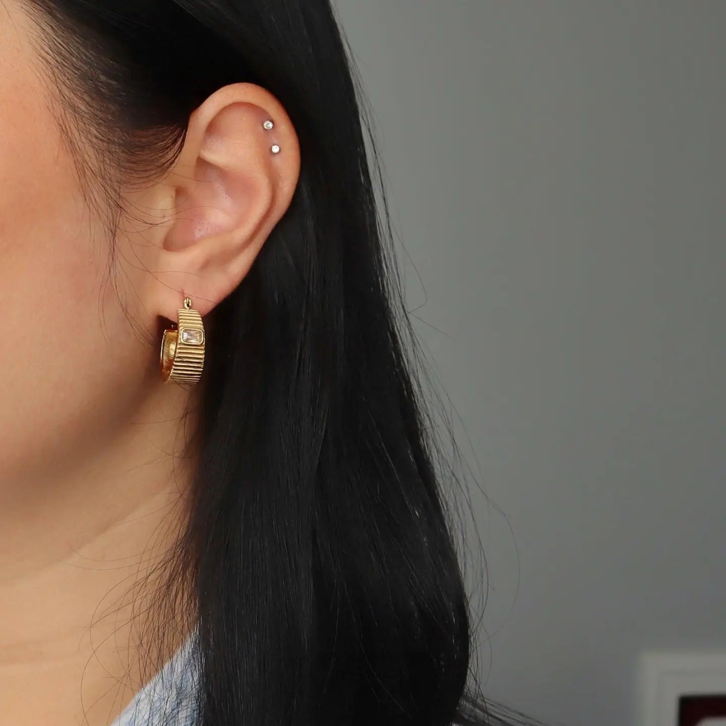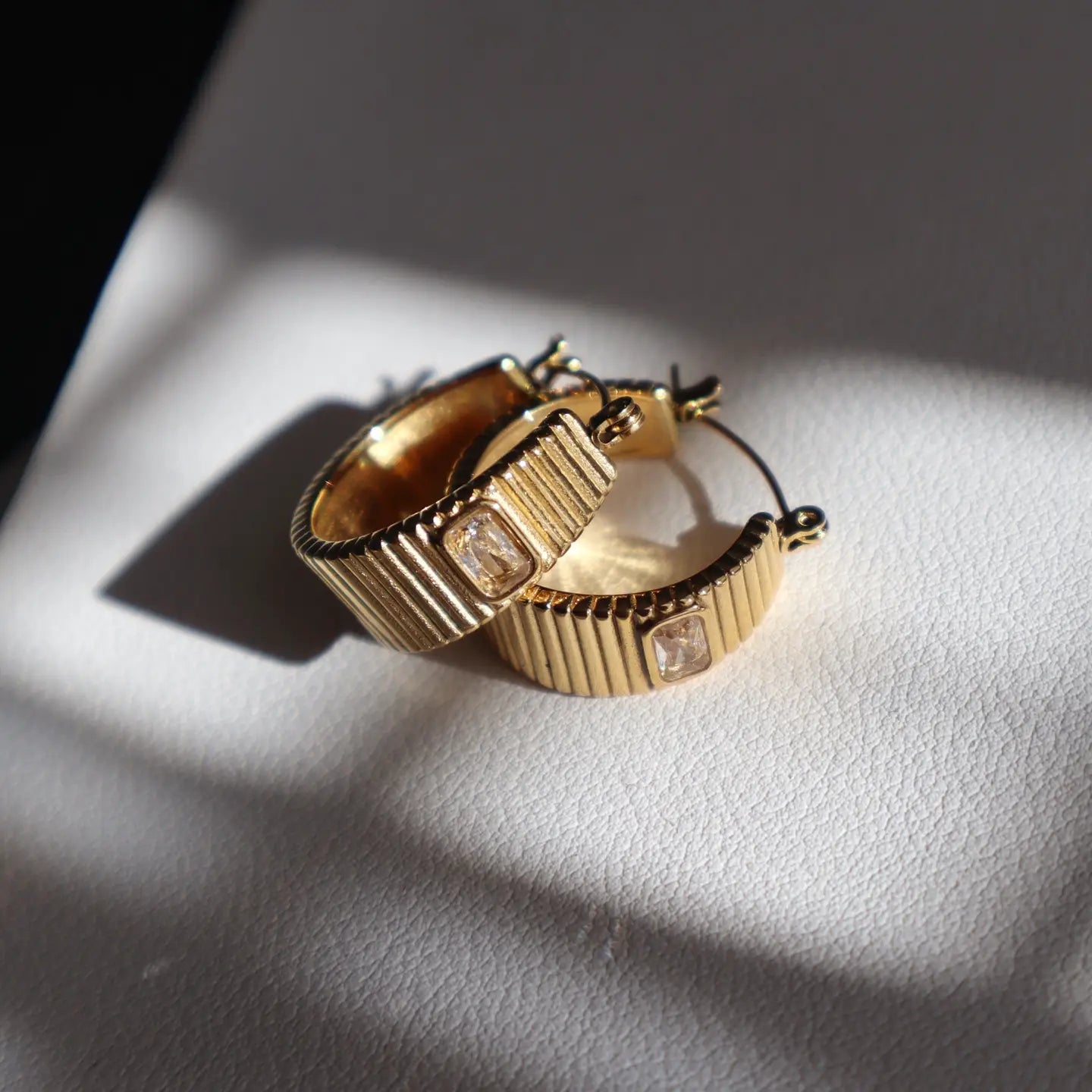 These chunky gold hoops feature a dazzling rectangular gem, adding a touch of glam to any outfit. -stainless steel, gold plated