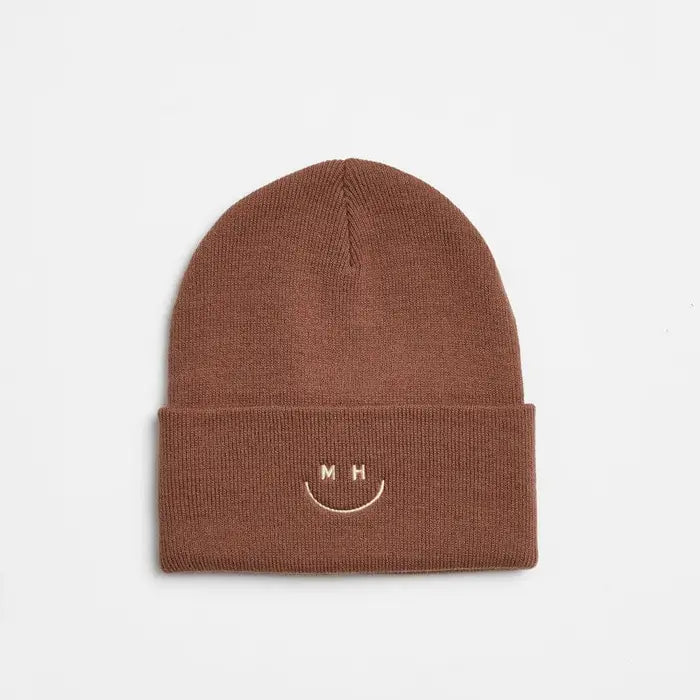 The Mad Hatter knit cuff beanie is the quintessential cold weather classic, featuring a longer profile to ensure a fit your little wonder will love and a wide rollover adjustable cuff. Features thick, acrylic yarn. Soft to the touch, the stretchy rib knit creates a stay-put fit. Fold up cuff with embroidered smiley MH logo. 100% acrylic rib knit.