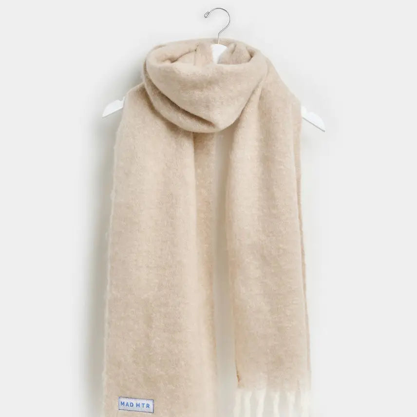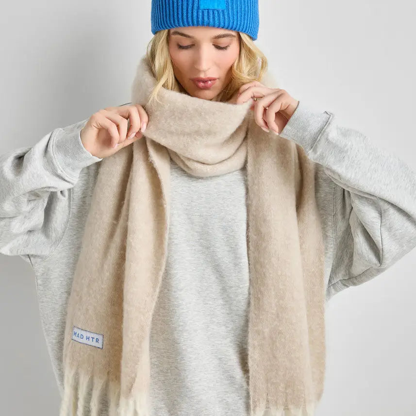 Your new go-to winter accessory. Designed super soft and oversized for layering in cold weather. Neutral multi-colored plaid pattern. Loose twisted fringe ends. Complementary MAD HATTER logo patch. 100% polyester. One size fits all. Hand wash cold. 90" x 11.5"