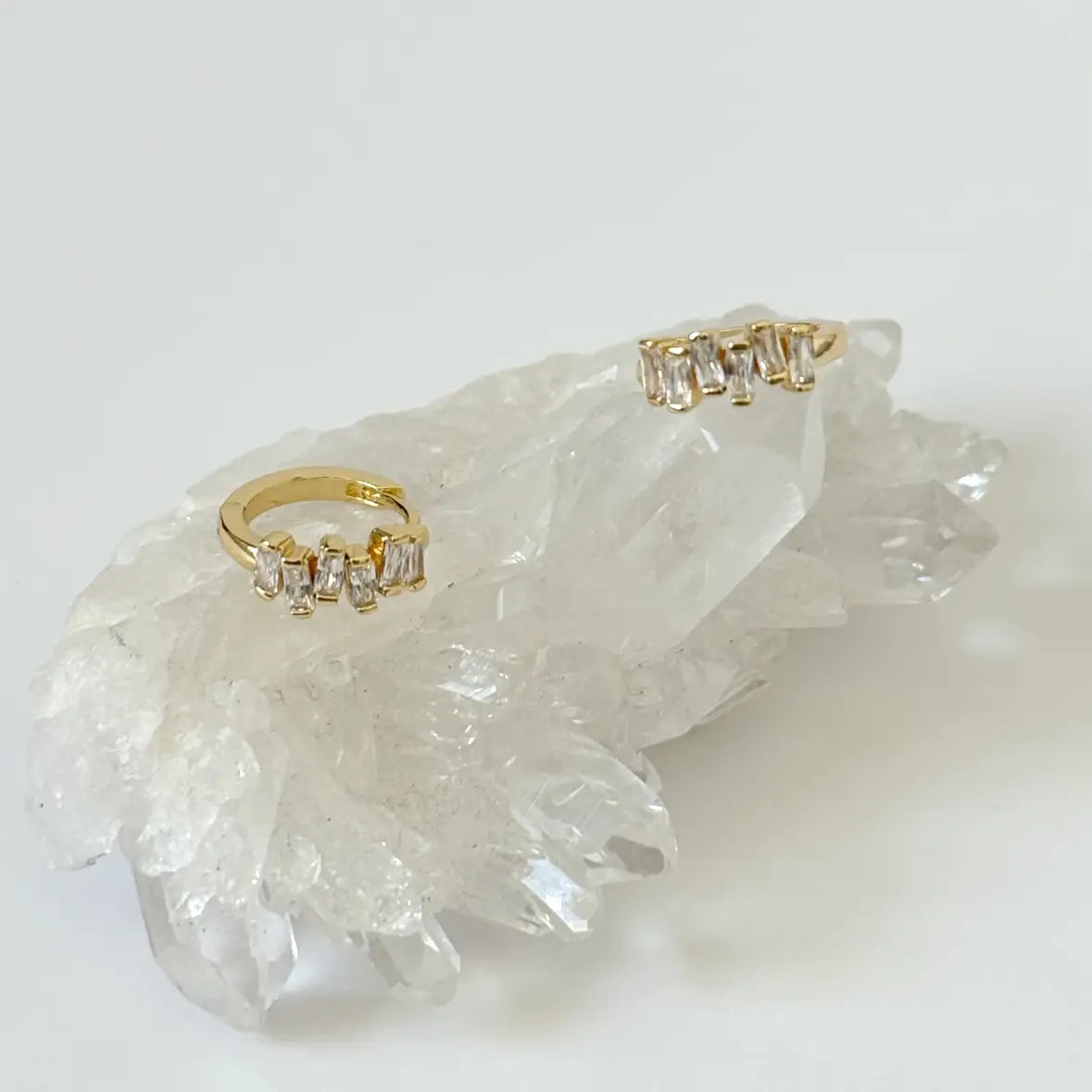 These hoop earrings are a must-have to complete any evening look or to dress up something a little more casual- Showcasing a modern baguette cut clear CZ stones make for a unique yet elegant look. Hoop Measures 13mm Adorned with Clear CZ stones Gold plated over Brass