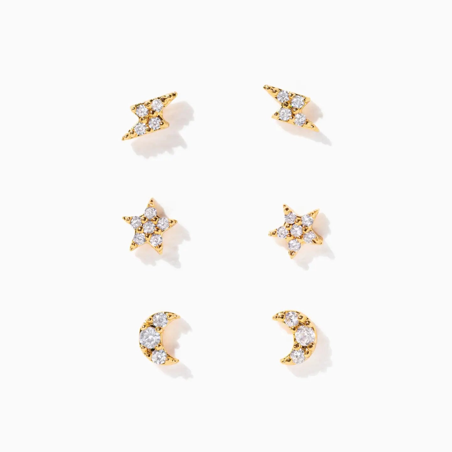 Transport yourself to another galaxy in this teeny tiny set! This set includes 3 pairs of studs, so you'll never run out of ways to sparkle!