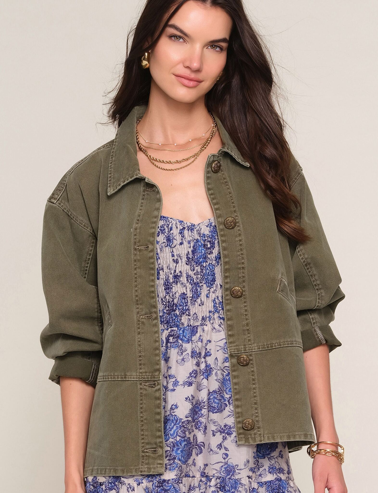 The earthy olive tone makes it incredibly versatile—throw it over a feminine dress for contrast or pair it with denim and a tee for a casual everyday outfit.