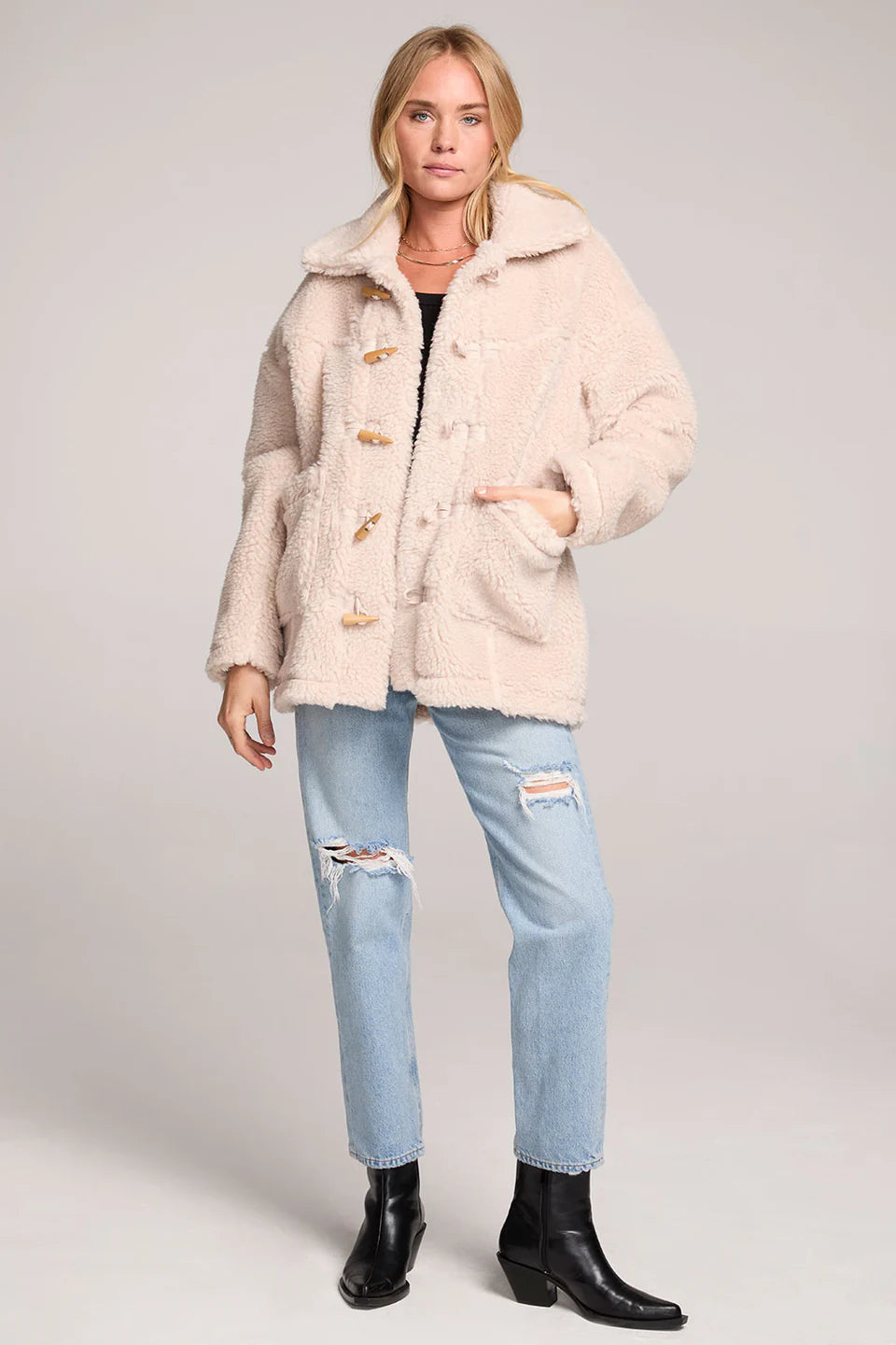The Finnley Jacket channels 70s glam with its cozy fleece fabric and wide lapels.