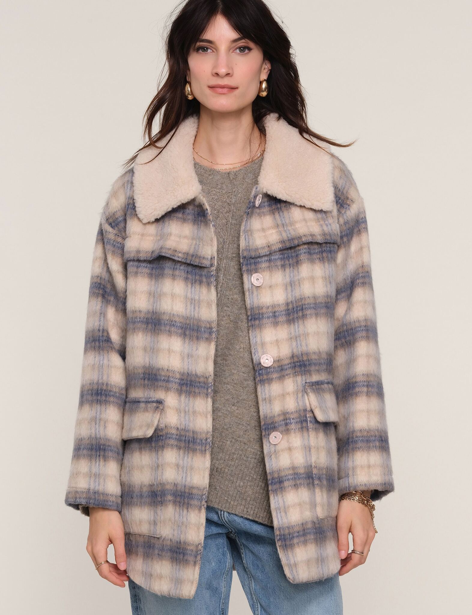 The Ithaca Coat is made from a textured, plaid tailoring. It features a relaxed fit, shirt tail hem and oversized patch pockets. It has a faux shearling collar for ultimate coziness.
