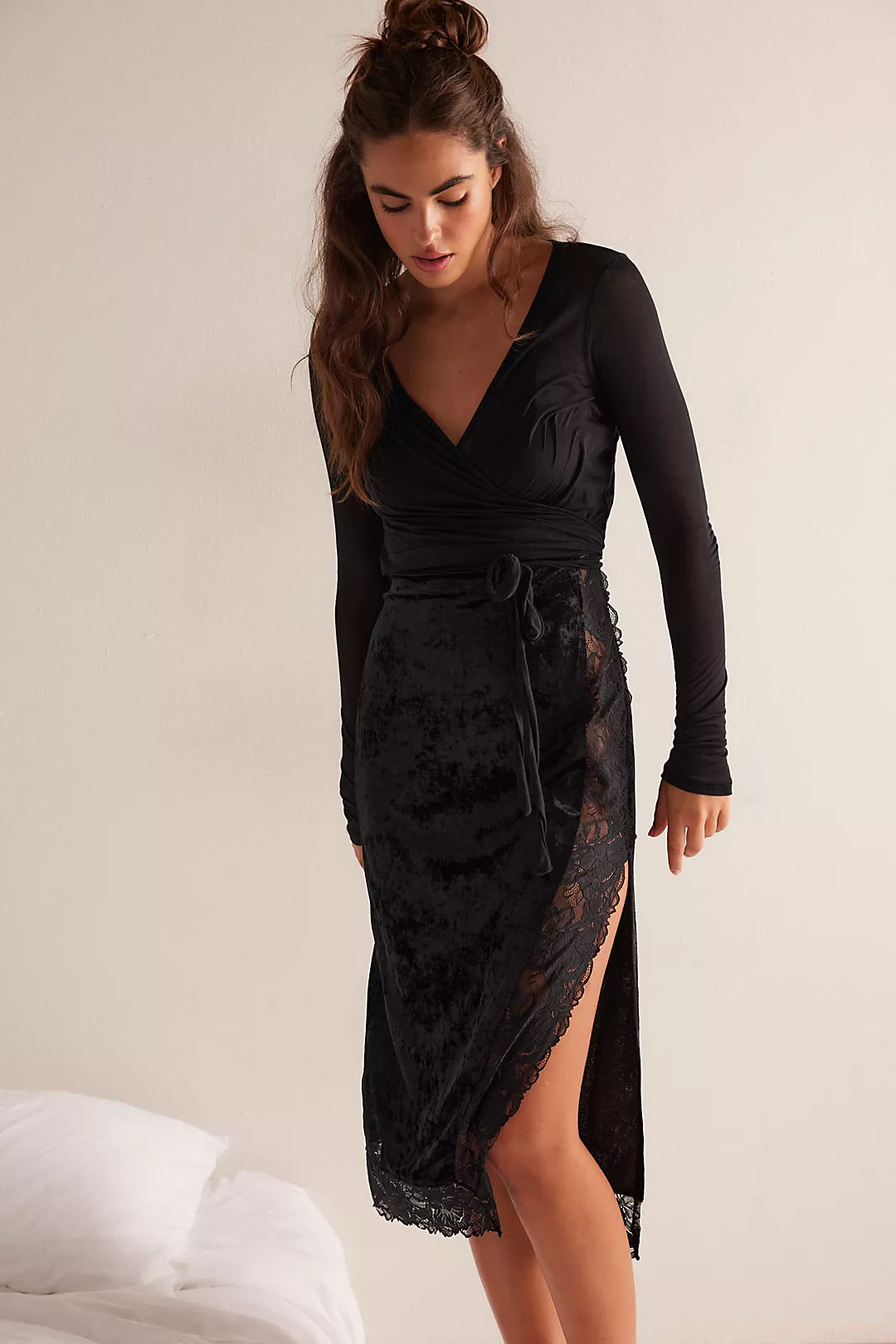 Dramatic details and a romantic silhouette make this midi slip from Intimately the perfect sultry addition to your wardrobe, featuring a soft, velvety fabrication, a plunging V-neck, and sheer lace panels for a sweeping, show-stopping finish.