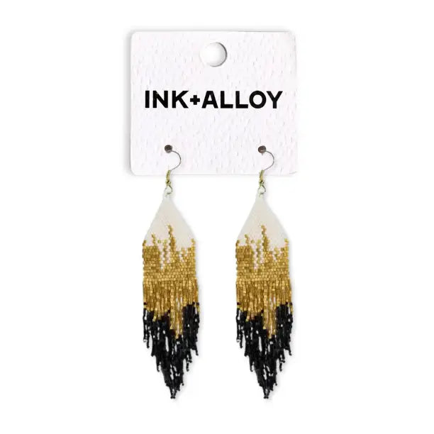 A must for those who love their everyday delicates with a touch of evening elegance. These gold, black and ivory ombre earrings are handwoven with an effortless shimmer to easily elevate any look!
