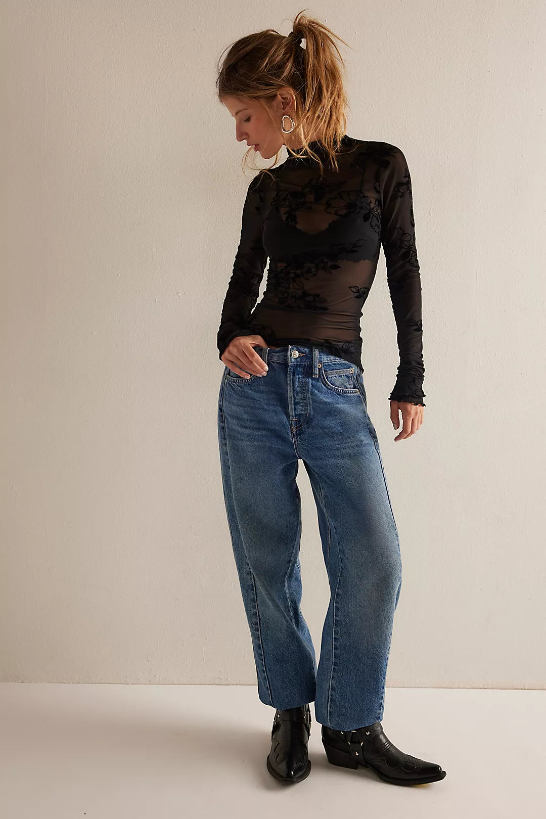 Edgy and perfect for layering, this long sleeve from Intimately features a sheer mesh fabrication, a mock neck design, and a lettuce trim for an added dimension.